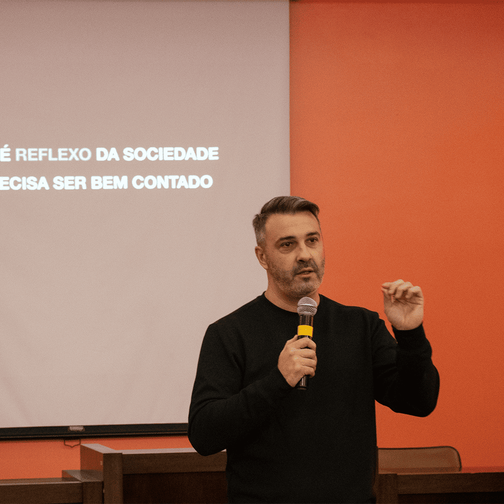 À noite, a programação seguiu com a palestra presencial de Rodrigo Oliveira, que falou sobre a construção de uma carreira jornalística e compartilhou experiências de cobertura em Copas do Mundo e Jogos Olímpicos.