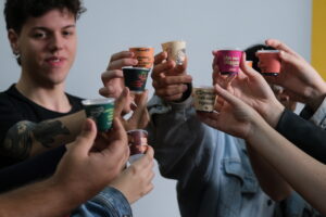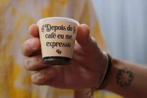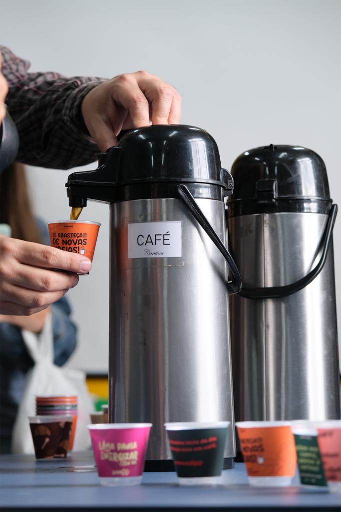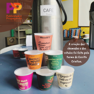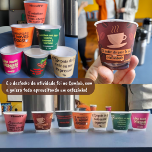 Os estudantes foram desafiados a criar chamadas sobre o café e rótulos para copos, a fim de testar suas habilidades de escrita e criatividade. Após o trabalho em sala de aula, eles levaram suas criações para o Comlab, um espaço de convivência do curso, onde serviram café e testaram suas mensagens com turmas e professores presentes.