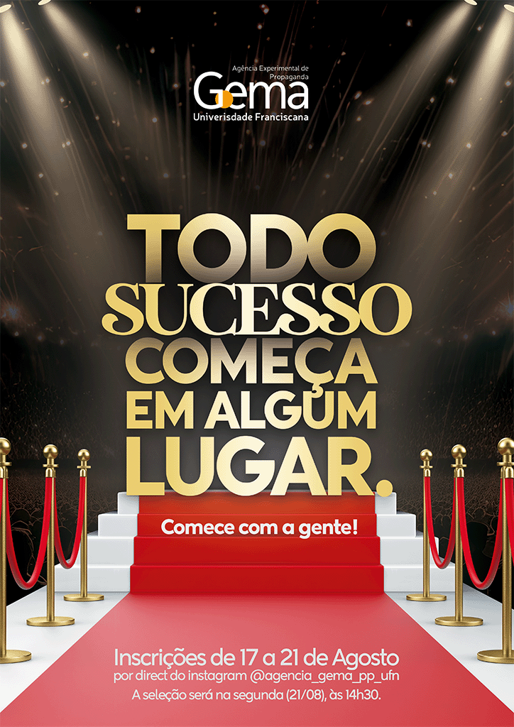 A campanha “Todo sucesso começa em algum lugar: comece com a gente!” foi desenvolvida pela equipe da Gema para selecionar novos voluntários que farão parte do time de criativos no segundo semestre de 2023.