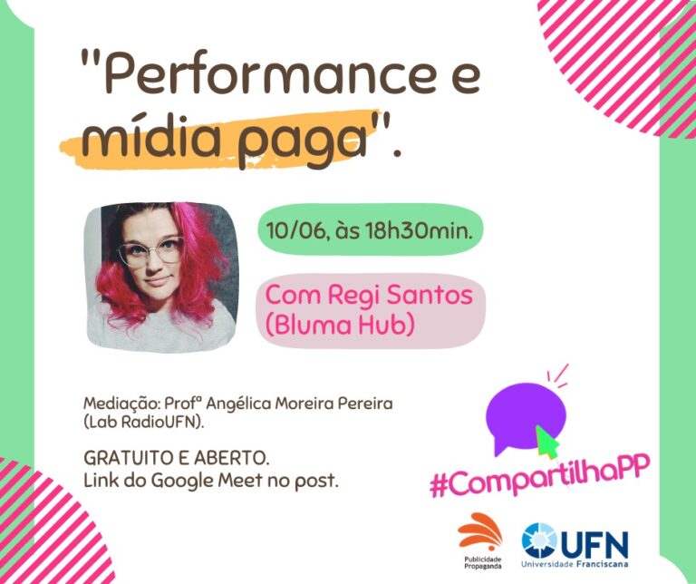 O Compartilha PP chega em sua segunda edição com o tema “Performance e mídia paga”, com a especialista em Gestão Estratégica de Projetos, fundadora e gestora da Bluma Hub, Regi Santos. A mediação do evento será com a professora responsável pela Radio UFN, Angélica Moreira Pereira. O evento é gratuito,