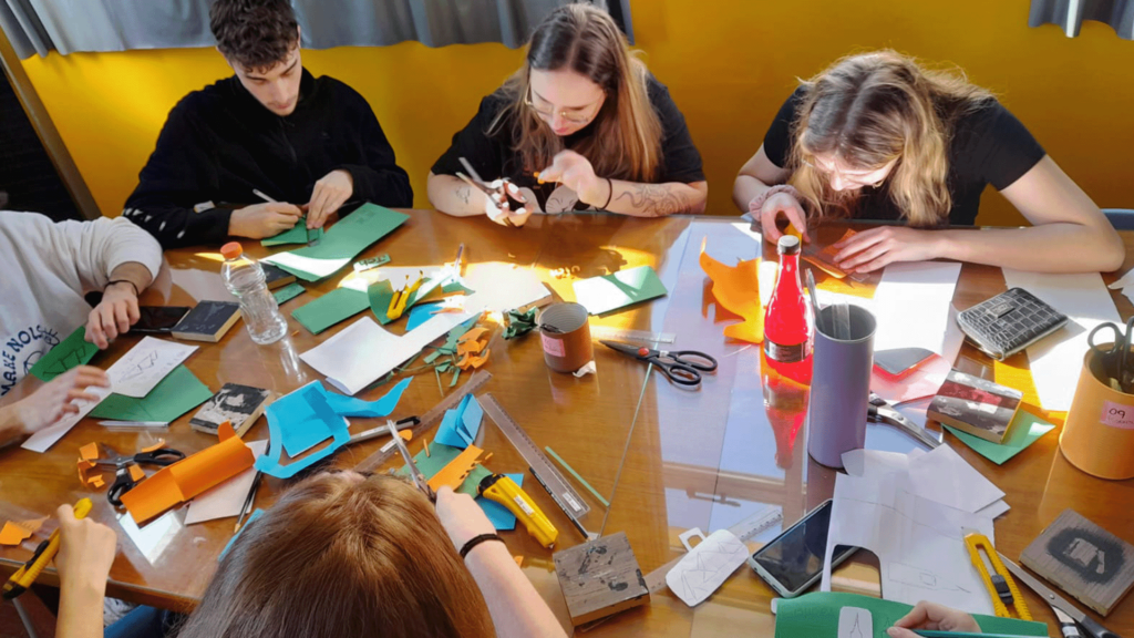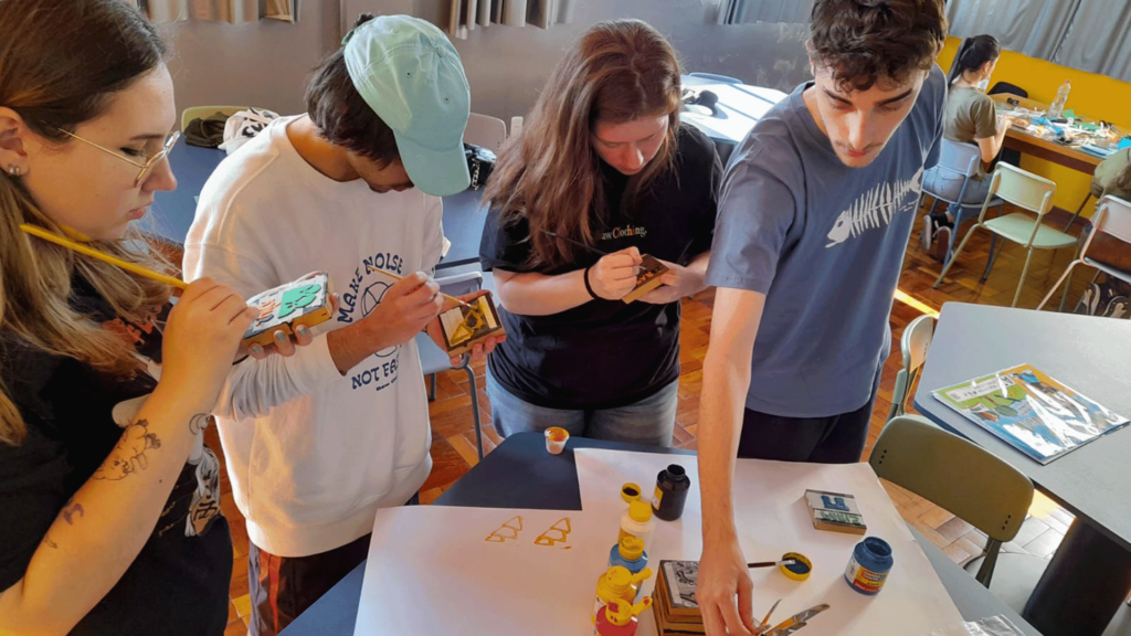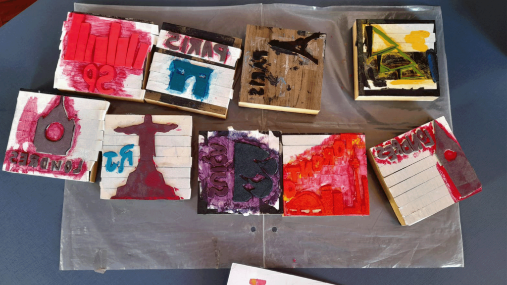Os alunos se reuniram no ambiente colaborativo do Comlab para iniciar a atividade de criação de carimbos. Utilizando EVA, o tema proposto foi a elaboração de cartões postais, e os acadêmicos puderam escolher seus pontos turísticos preferidos para criar.