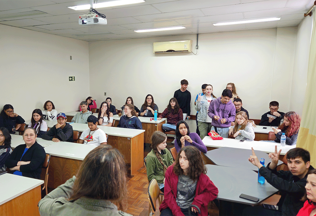 A visita integrou uma atividade da disciplina de Planejamento de Campanha, ministrada pela professora Pauline Neutzling Fraga, e teve como principal objetivo apresentar aos estudantes o funcionamento do curso, suas disciplinas, ferramentas e possibilidades profissionais. A ação também fez parte do projeto desenvolvido na disciplina de Estudos Orientados (EO) do Colégio, que tem como foco a criação de uma campanha de conscientização sobre inclusão de pessoas com deficiências e transtornos do neurodesenvolvimento, como autismo, TDAH e TOD.