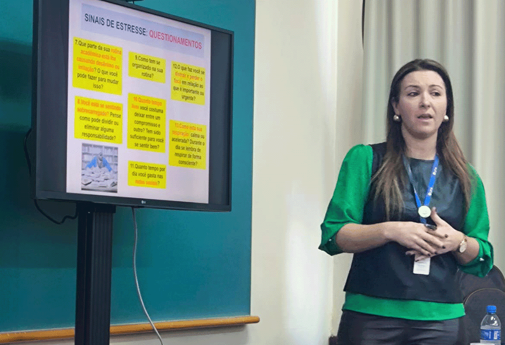 A oficina teve como objetivo apresentar técnicas embasadas na neurociência para ajudar estudantes e profissionais a gerenciar o estresse e aprimorar o desempenho acadêmico e profissional. Logo no início, Janaína trouxe um dado alarmante: entre 2014 e 2024, o Brasil registrou um aumento de 68% nos afastamentos do trabalho causados por ansiedade e depressão, reflexo das pressões do mercado e dos impactos da pandemia, segundo o portal G1. A neurocientista explicou como o estresse afeta a química cerebral, prejudicando a memória, o aprendizado e, quando crônico, elevando os níveis de cortisol — o que pode desencadear doenças como hipertensão e depressão.