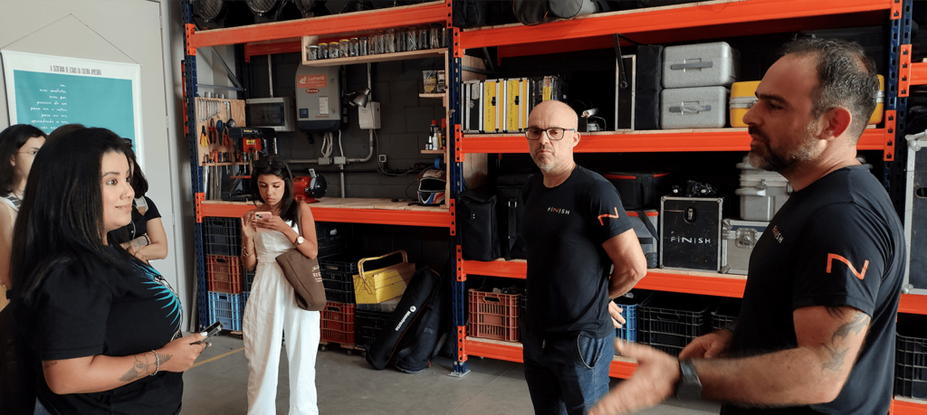 Durante a visita, os alunos foram recebidos por uma equipe composta por Christian Ludtke, Evandro Rigon, Leo Roat, Maira Trindade, Lucas Hoeppers e Thiago Ribeiro. Cada membro da equipe se apresentou, explicou como as atividades são distribuídas dentro da produtora e compartilhou suas experiências sobre as mudanças no mercado audiovisual. Christian Ludtke, sócio fundador da Finish, destacou: “Começamos no analógico, passamos para o digital e, hoje, estamos lidando com a inteligência artificial. Nossa missão sempre foi estar à frente dessas transformações, utilizando as novas tecnologias para transformar ideias em realidade.”
